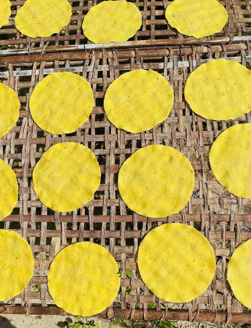 - Chế biến: Khoai lang được làm sạch, hấp chín và xay nhuyễn, sau đó trộn đều cùng với gừng. Hỗn hợp này sau đó được tráng mỏng thủ công và phơi khô tự nhiên dưới ánh nắng mặt trời.